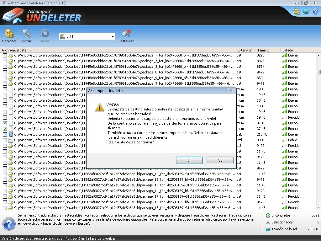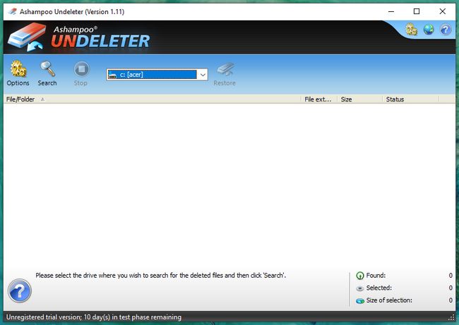 В интерфейсе у Ashampoo Undeleter нет «комбайна» из десятков режимов. Основной сценарий уложен в четыре команды на верхней панели: Options, Search, Stop, Restore. Вы выбираете том в выпадающем списке, запускаете поиск, отмечаете нужные файлы галочками и восстанавливаете их в выбранное место. Отдельно важная деталь — программа показывает состояние найденных объектов: можно заранее понять, какие файлы реально поднять целиком, какие восстановятся частично, а какие уже не имеют смысла вытаскивать.