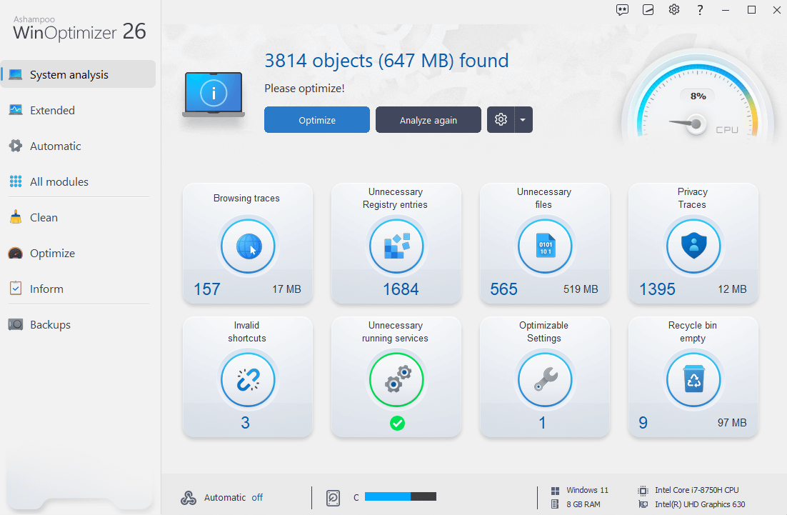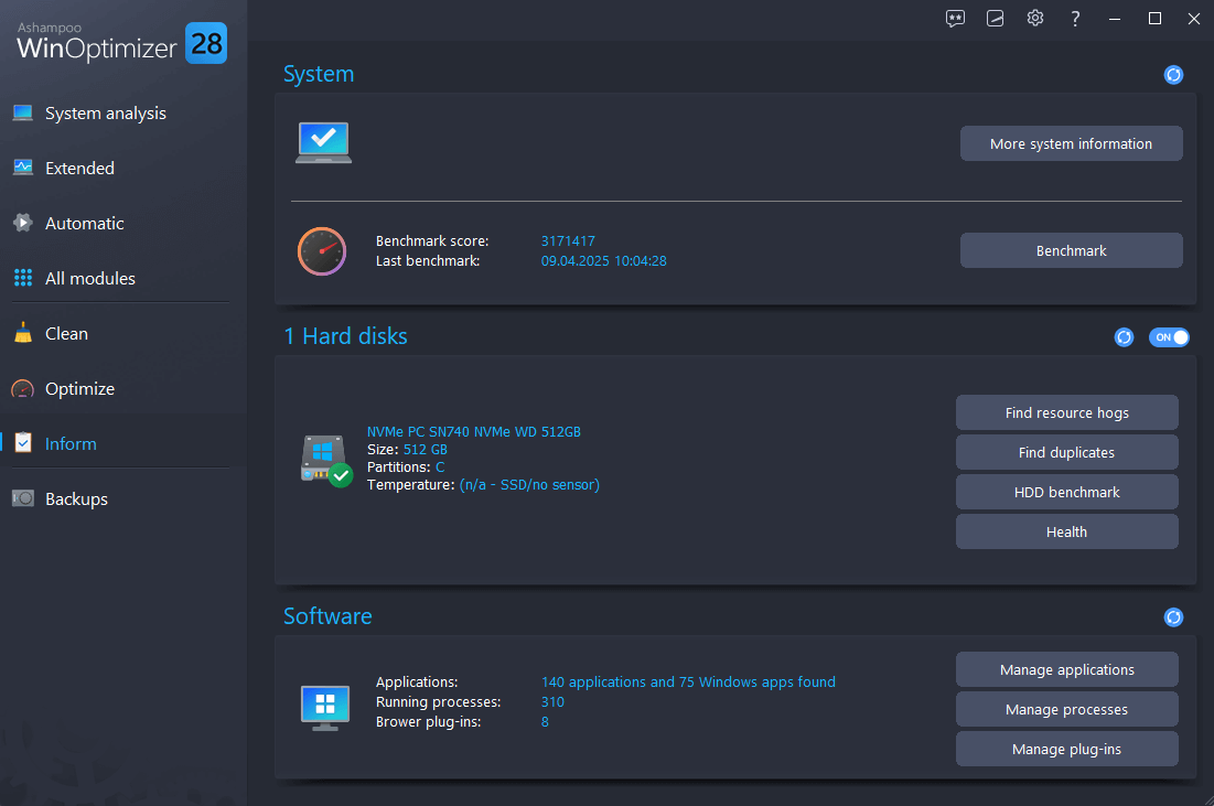Ashampoo WinOptimizer 2026 — практичный оптимизатор Windows с упором на понятные модули и управляемые действия: анализ, очистка интернет-следов, управление службами и процессами, диагностика дисков, защита приватности и административные инструменты. Главные преимущества здесь не в «магическом ускорении», а в том, что WinOptimizer собирает обслуживание системы в единую консоль с конкретными кнопками, журналикой/отчётами и механизмами отката (Backups + System Restore Manager).