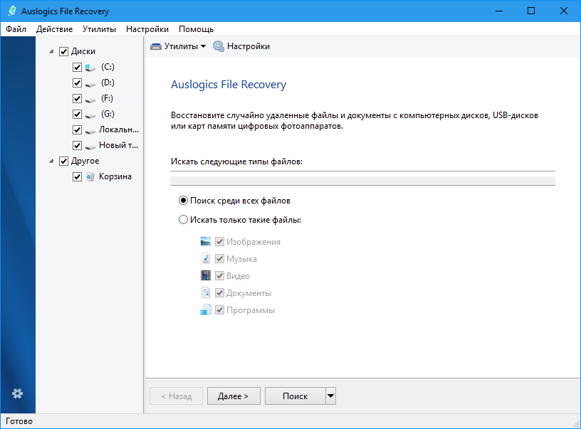 Интерфейс Auslogics File Recovery: из чего состоит главное окно