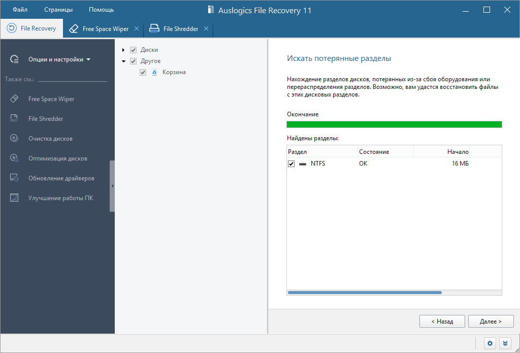 Когда раздел удалён или исчез из разметки, в Auslogics File Recovery есть отдельный мастер поиска потерянных разделов.