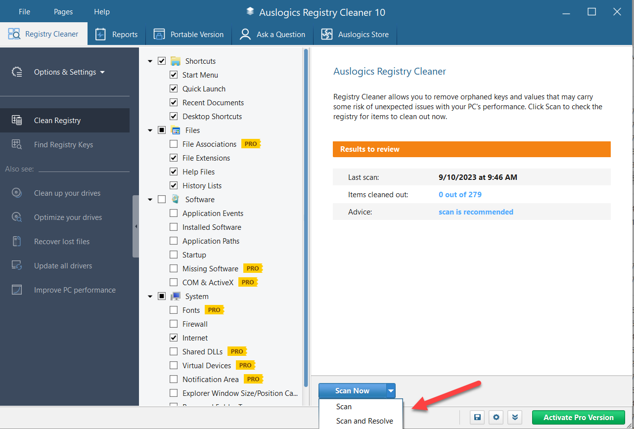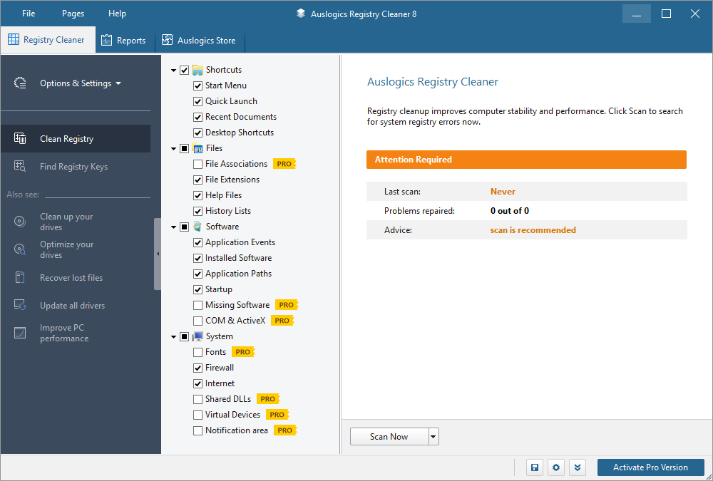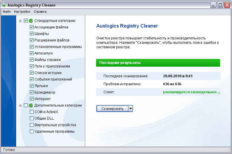 | Проверить реестр по выбранным категориям | Вкладка Registry Cleaner → список категорий → Scan Now |