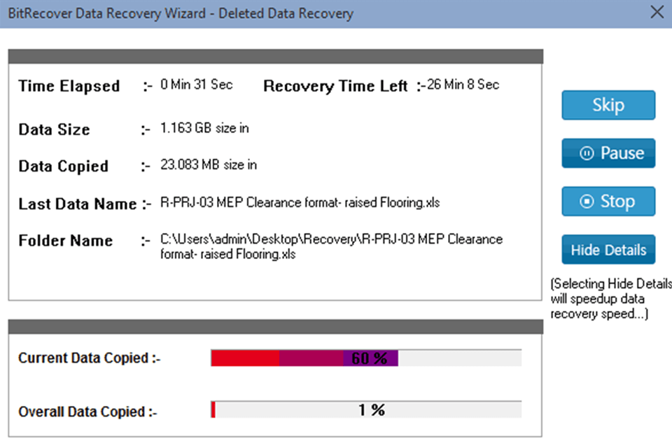 В бесплатном режиме BitRecover Data Recovery Wizard восстанавливает данные в пределах лимита до 5 GB. Это удобно для «разовой» задачи: вернуть папку с документами, несколько гигабайт фото/видео, рабочие файлы проекта, которые удалили по ошибке.