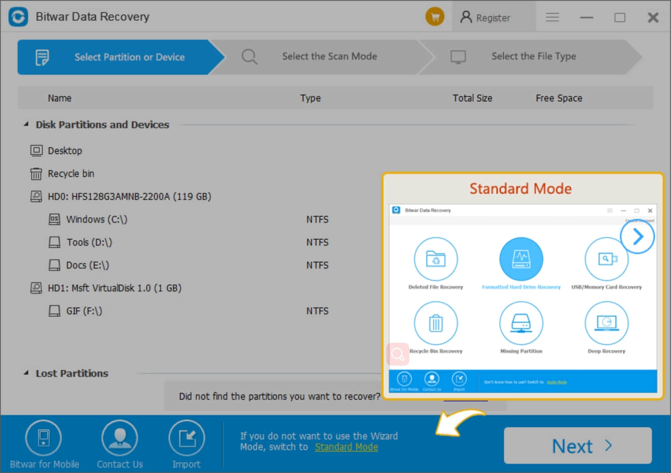 Bitwar Data Recovery построен вокруг двух способов работы: