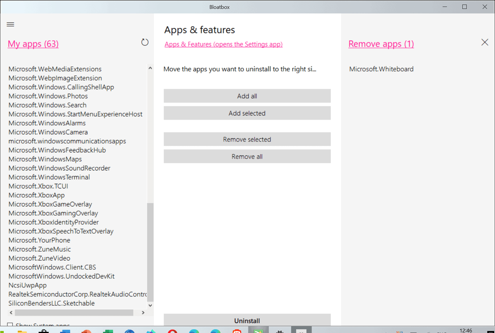 Логика здесь очень прозрачная. Левая колонка означает «что есть в системе», правая — «что будет удалено». Кнопка Add selected > переносит только выделенные позиции из списка приложений в список удаления, Add all >> переносит весь список целиком, << Remove all возвращает всё назад, а < Remove selected убирает из очереди только выбранные позиции. Такой подход работает лучше, чем модель с галочками внутри одного списка: пользователь визуально видит две разные стадии — доступные пакеты и очередь на деинсталляцию. Для обзорной программы это одна из самых сильных находок Bloatbox.