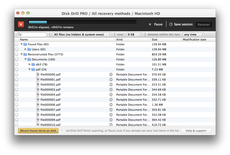 Этот шаг быстро «поднимает» структуру доступных файлов, которые на диске существуют сейчас и читаются. В macOS это ещё и часть бесплатного восстановления в Basic — такие найденные элементы можно вернуть без покупки PRO.