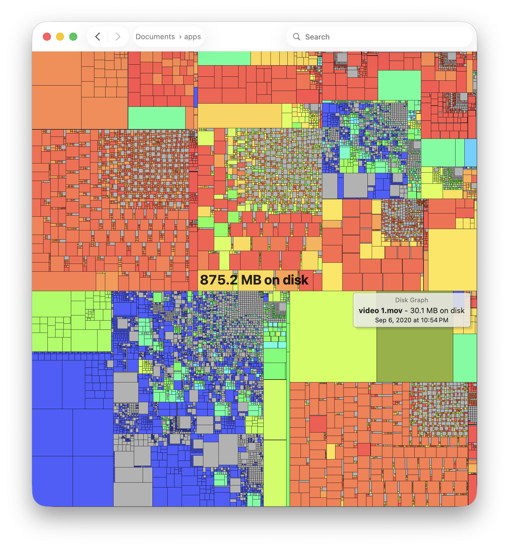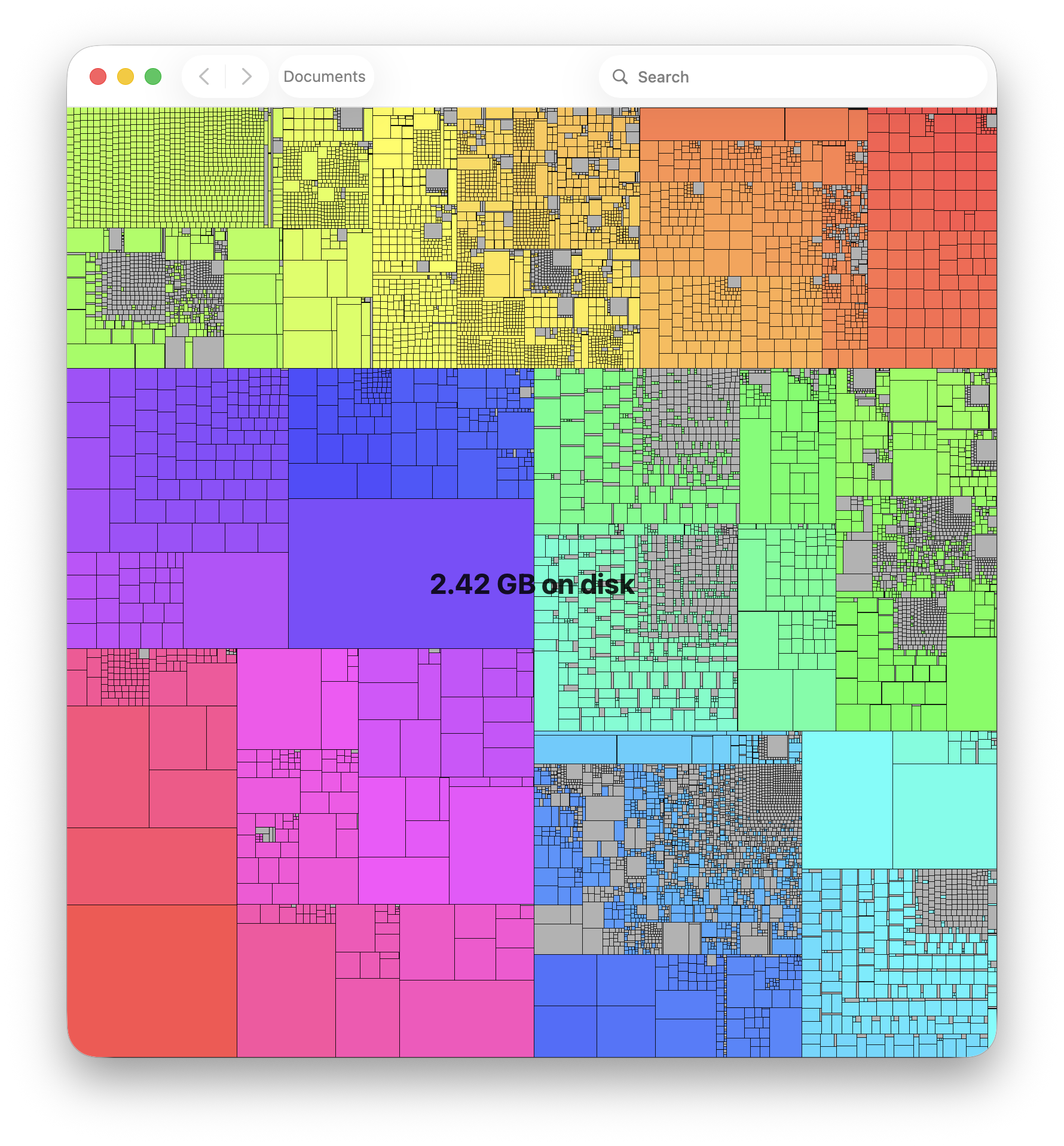 GrandPerspective — классическая утилита для macOS, которая показывает использование диска через treemap. Каждый файл отображается прямоугольником, площадь которого пропорциональна размеру; файлы одной папки группируются вместе. Это сильный и очень понятный инструмент для тех, кто любит именно treemap-представление.