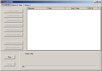 Верхняя строка вкладок в стандартной конфигурации включает DoubleKiller, Options, Help и About. Это уже многое говорит о характере программы. В ней нет сложной навигации, нет скрытых мастеров настройки и дополнительных панелей. Практически всё важное сосредоточено на двух рабочих экранах: стартовом окне результатов и вкладке Options. В этом и плюс, и минус. С одной стороны, интерфейс устаревший внешне. С другой — он предсказуемый, и после первого прохода по кнопкам становится понятно, где именно настраивать поиск дубликатов файлов, где смотреть результаты и где подтверждать удаление. Набор основных действий расположен открыто: Run, Cancel, кнопки отметки файлов и команды удаления либо переноса. В результате DoubleKiller ощущается как инструмент, а не как оболочка с эффектами.