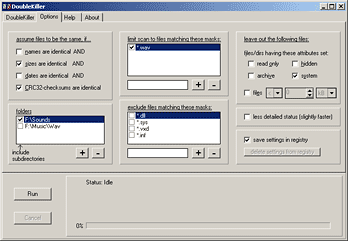 Если главное окно отвечает за результаты, то вкладка Options отвечает за весь смысл поиска. Именно здесь пользователь определяет, какие файлы считать одинаковыми, какие папки сканировать, какие маски учитывать, что исключать и как ограничивать выдачу. У DoubleKiller нет отдельного мастера перед запуском: всё управление сосредоточено здесь.