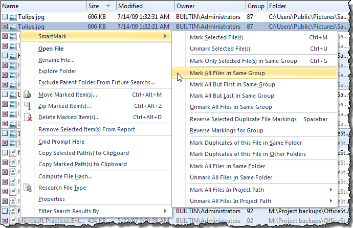В реальной работе самая трудная часть начинается не на этапе поиска, а на этапе отбора того, что действительно нужно удалить или переместить. Именно здесь у Duplicate File Detective включается SmartMark — встроенная система assisted selection technology для автоматической маркировки дублей. Программа позволяет массово помечать файлы по Position, Path, Age, Size, Name Length и Music Tag. Дополнительно поддерживается маркировка по пути через wildcard или regular expression pattern matching.