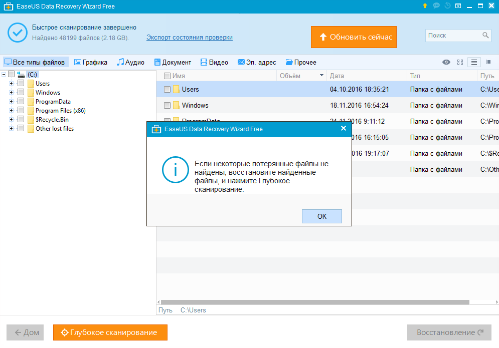 В EaseUS Data Recovery Wizard логика устроена последовательно: сначала быстрый проход, затем глубокий. В описаниях программы подчёркивается, что быстрый этап находит недавно удалённое, а глубокий полезен при форматировании и повреждениях.