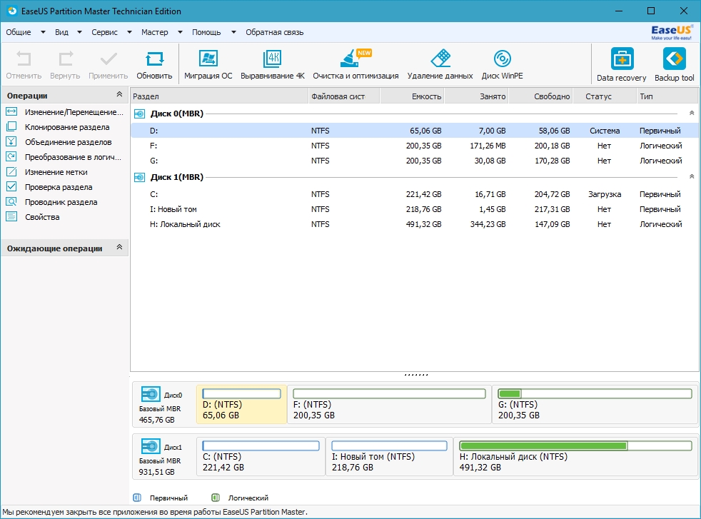 Интерфейс EaseUS Partition Master построен вокруг четырёх зон: