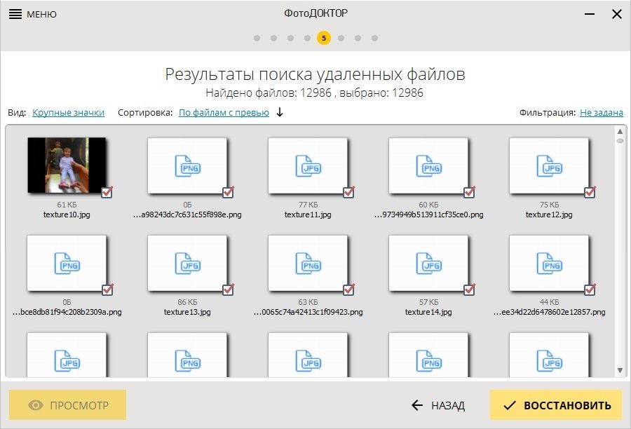 Когда сканирование завершено, вы попадаете в ключевое окно программы — Результаты поиска удаленных файлов. Здесь ФотоДОКТОР показывает найденные изображения в виде сетки миниатюр.