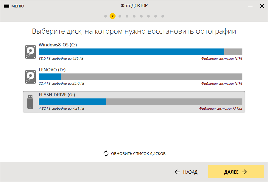 Первый экран начинается с прямого вопроса: Выберите диск, на котором нужно восстановить фотографии. Это важный момент: программа не просит «указать папку», она работает на уровне диска/носителя. На экране отображается список устройств с буквами дисков, а под каждым — индикатор заполненности и информация о файловой системе.