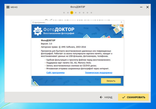 Интерфейс программы сделан «мастером» — это видно уже по структуре экранов и кнопкам перехода: на каждом шаге есть НАЗАД и кнопка продолжения (ДАЛЕЕ или СКАНИРОВАТЬ), а сверху — индикатор шагов точками.