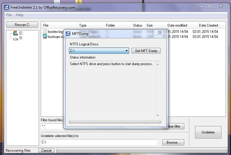 Помимо восстановления удалённых файлов, в FreeUndelete присутствует отдельная утилита MFT Dump Utility. Она позволяет выбрать логический NTFS-диск, показывает статусную информацию по Master File Table и записывает дамп в файл MFTDump.hex в корень выбранного диска.