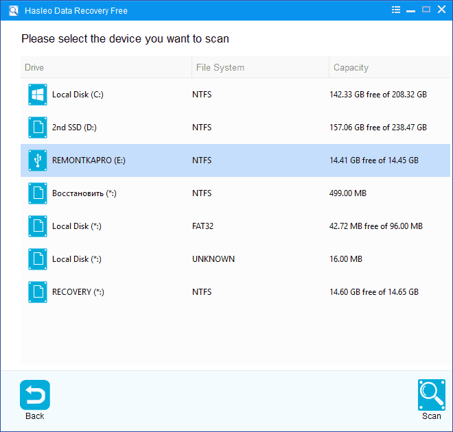 Практически это означает, что интерфейс программы Hasleo Data Recovery ориентирован на выбор «локации/устройства», а не на конкретный бренд накопителя: вы выбираете букву диска, физический диск или раздел, после чего запускаете Scan.