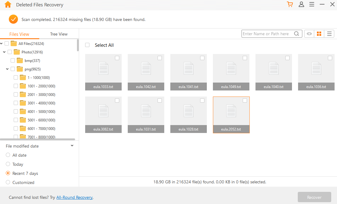 Стартуйте сканирование и сразу используйте поиск/фильтры — AnyRecover позволяет просматривать результаты по мере заполнения.