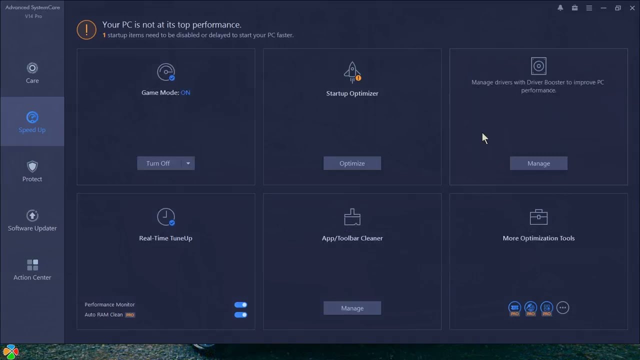 Дает отдельный блок ускорения: Turbo Boost, Startup Optimizer, Hardware Accelerator, App/Extension Cleaner, Real-time TuneUp и дополнительные инструменты оптимизации.
