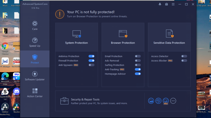 Advanced SystemCare активно помечает расширенные возможности как Pro прямо в интерфейсе (в Quick Settings и по отдельным модулям Protect/Speed Up/Toolbox).