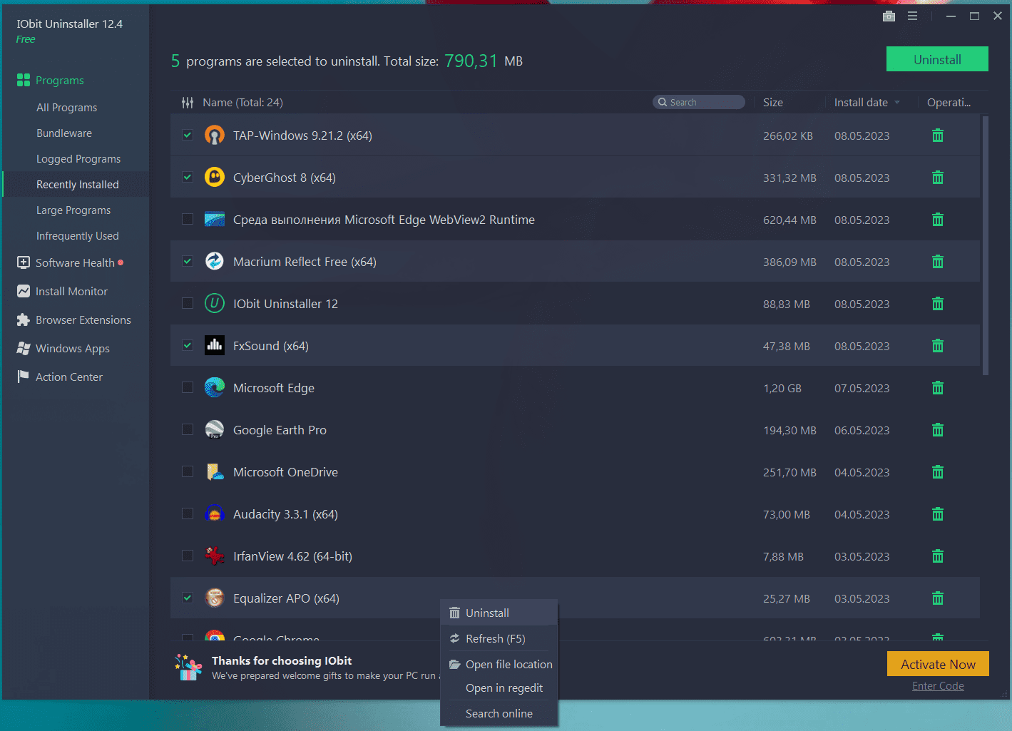 В IObit Uninstaller важная часть работы выполняется из контекстного меню строки. По правому клику на программе открываются пункты: