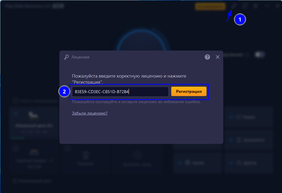 Логика типовая: в программе есть переход к регистрации Pro-издания, а ключ вводится в окне регистрации. Это подтверждается тем, что после ввода серийного кода режим переключается с Free на Pro и открывает восстановление через Recover.