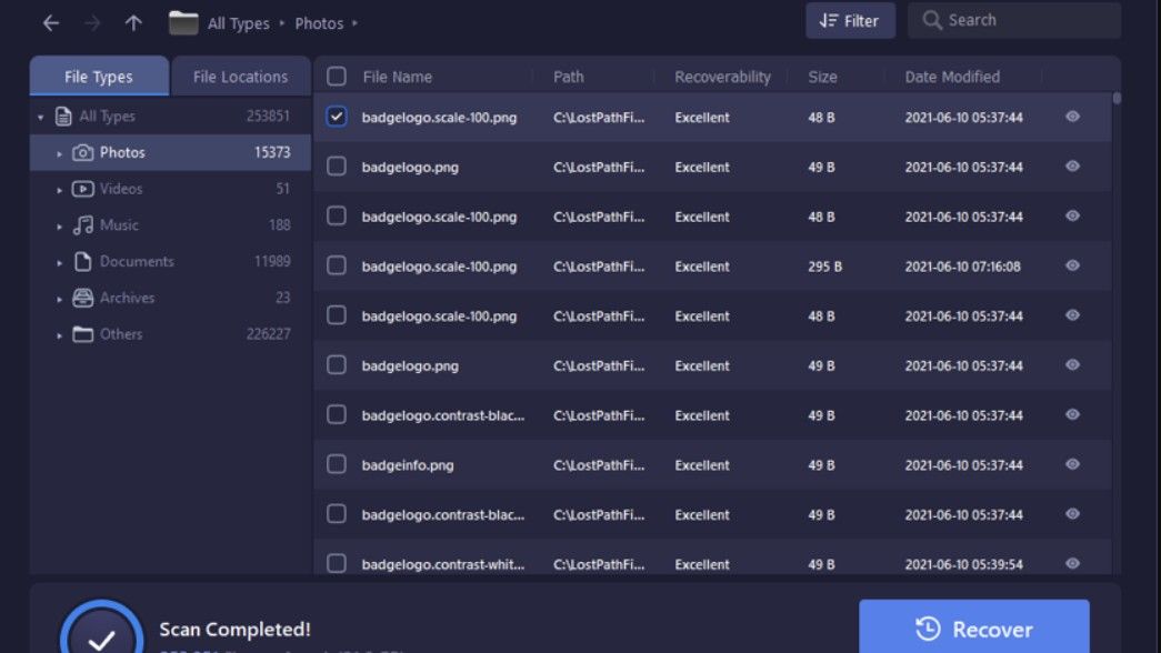 Понятный сценарий работы: выбор Location и File Type → запуск → фильтр → предпросмотр → Recover.