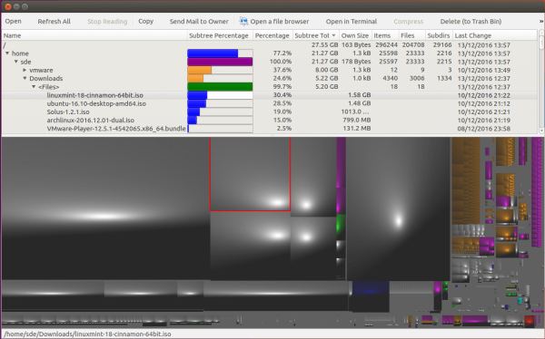 Subtree Total, проценты, число элементов, файлов, подкаталогов и дата изменения — это именно тот набор, который нужен для анализа занятого места Linux. -