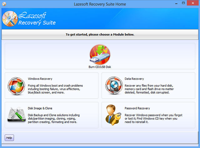 Чёткая модульная структура: Burn CD/USB Disk, Windows Recovery, Data Recovery, Disk Image & Clone, Password Recovery — на одном стартовом экране, без лишней навигации.