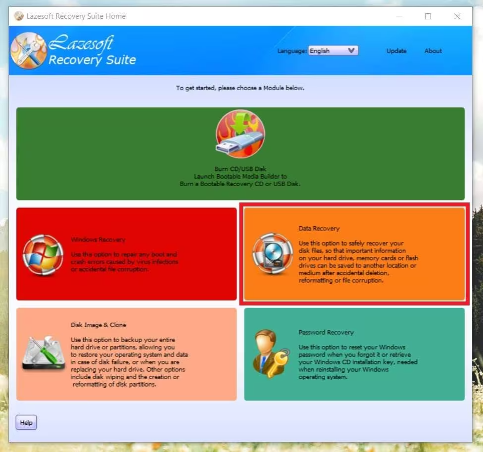 Важная особенность Lazesoft Recovery Suite — структура «пять крупных модулей» на стартовом экране: создание аварийного диска, восстановление Windows, восстановление данных, резервное копирование/клонирование и восстановление паролей. Именно этот подход делает программу удобной: вы не ищете нужную функцию по подменю, а выбираете сценарий и дальше идёте по мастеру.