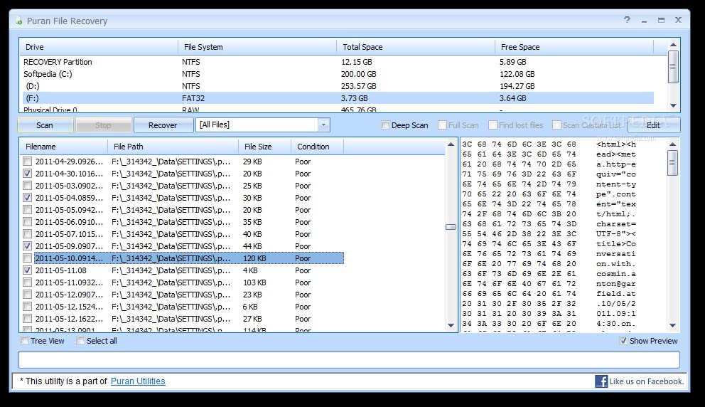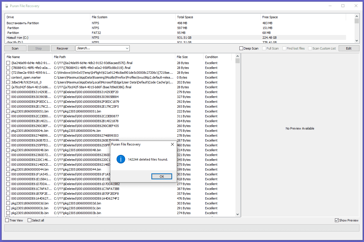 Puran File Recovery — именно тот тип утилиты, который ценят за практичность: выбрали диск, нажали Scan, отфильтровали Search…, оценили Condition, восстановили через Recover в нужном формате. При этом программа не ограничивается «простым undelete»: Deep Scan, Full Scan с поиском потерянных разделов, работа с RAW/Physical drives и сигнатурное сканирование через Scan Custom List делают её заметно более мощной, чем многие «быстрые» восстановители.