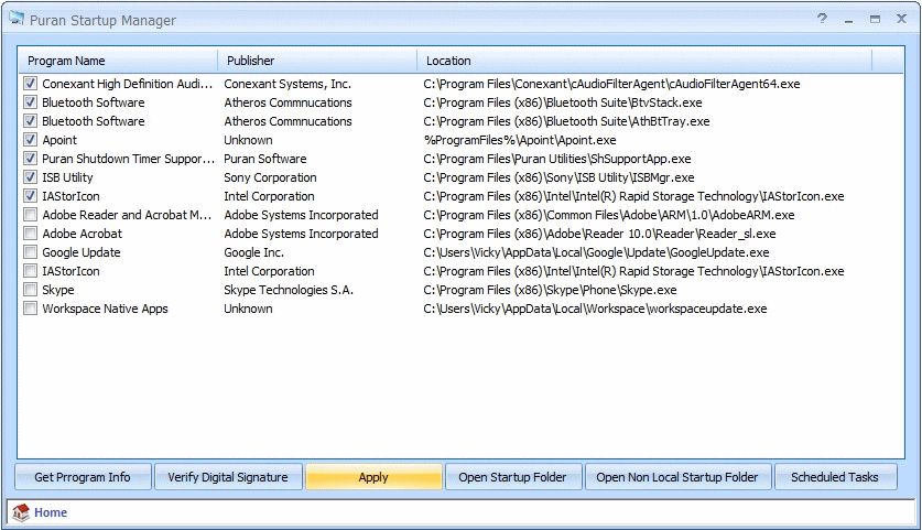 Startup Manager: отключаете лишние пункты, проверяете подпись, применяете через Apply.