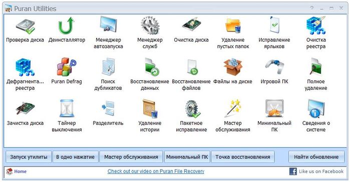На главном экране Puran Utilities размещены ярлыки модулей (иконки с подписями). В актуальной сборке 3.2.1 в этом списке присутствуют: