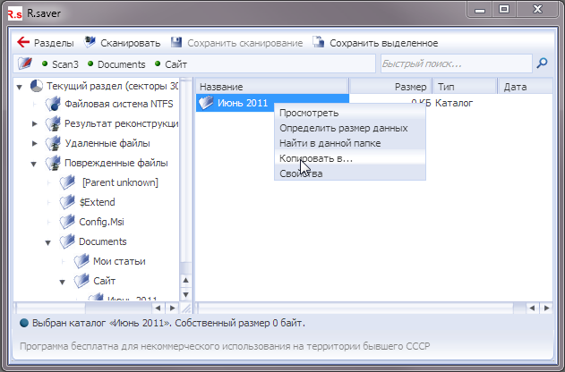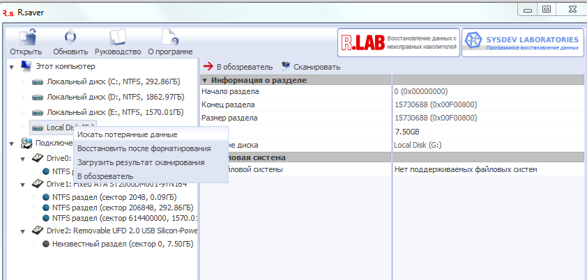 Форматирование бывает разным. Самый частый случай — быстрое форматирование, когда структура файловой системы пересоздаётся, а содержимое секторов ещё не затёрто. В R.saver это отрабатывается стандартно: выбираете объект, запускаете Сканировать, затем ищете данные в реконструкции и в разделах дополнительно найденного.