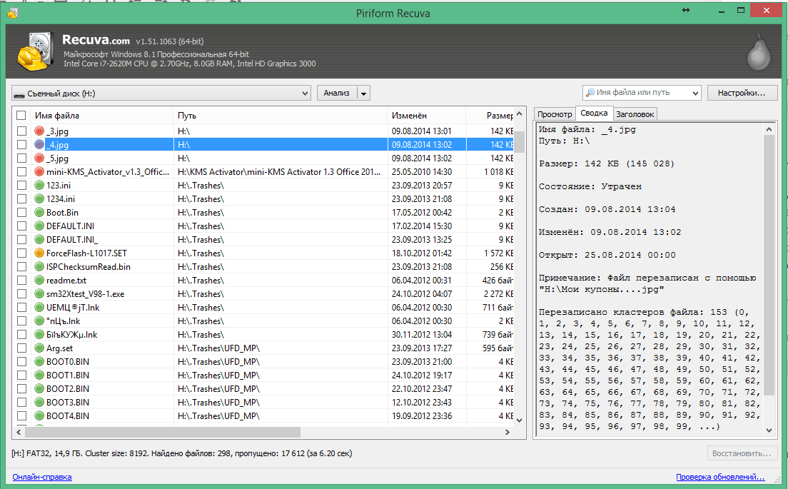 Отдельная полезная область применения — Recuva восстановление фото и видео с карт памяти: карточка подключается как обычный диск, затем проводится сканирование и отбор по состоянию (State) и превью.