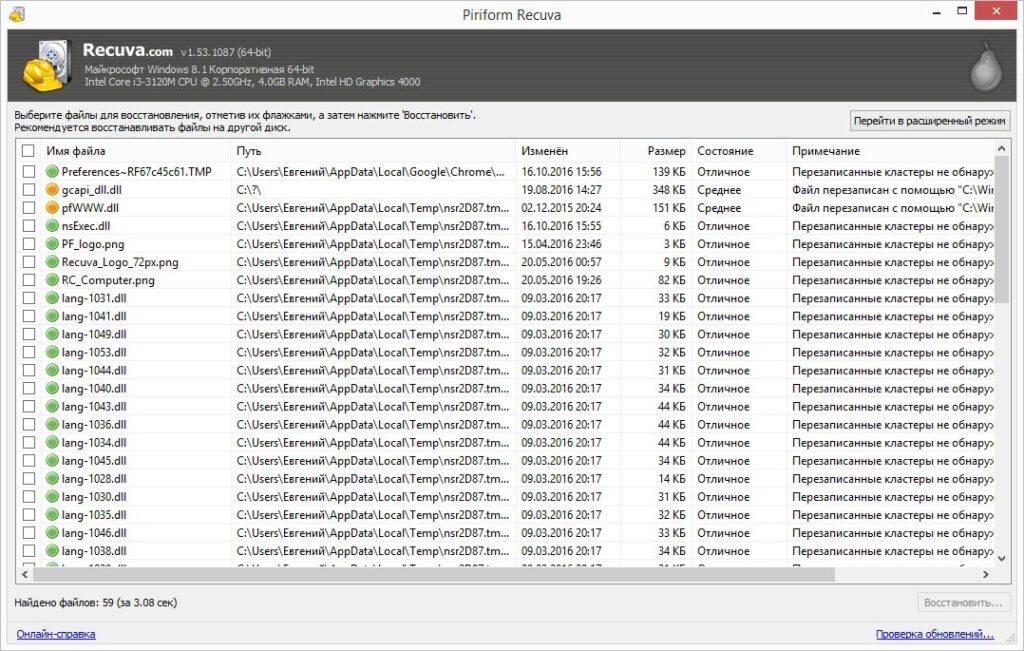 После Scan или Deep Scan Recuva показывает список найденных объектов.