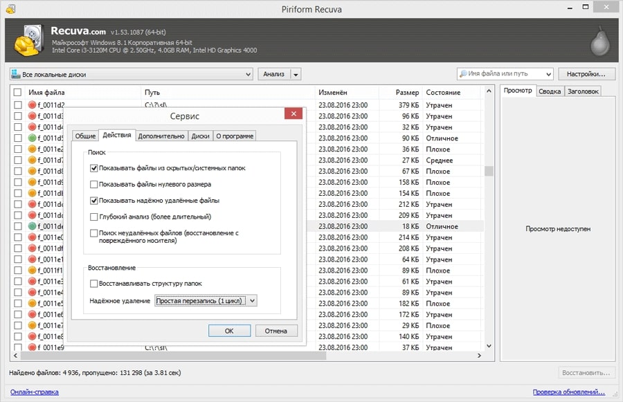 Для сложных случаев в Recuva предусмотрена настройка, при которой список результатов включает не только удалённые, но и существующие файлы. Это применяется для восстановления после форматирования, когда файловая таблица перестроена. Настройка включается в Options на вкладке Actions через пункт Scan for non-deleted files.