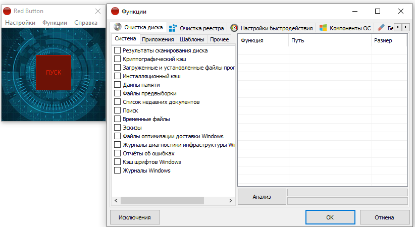 Red Button закрывает типичные задачи «быстрой уборки» и точечной настройки Windows: