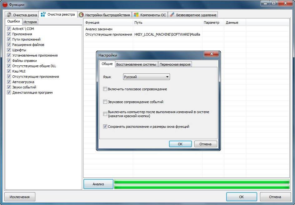 чистка реестра: следы активности + категории «ошибок» (битые ссылки, ActiveX/COM, неверные пути и т. д.);