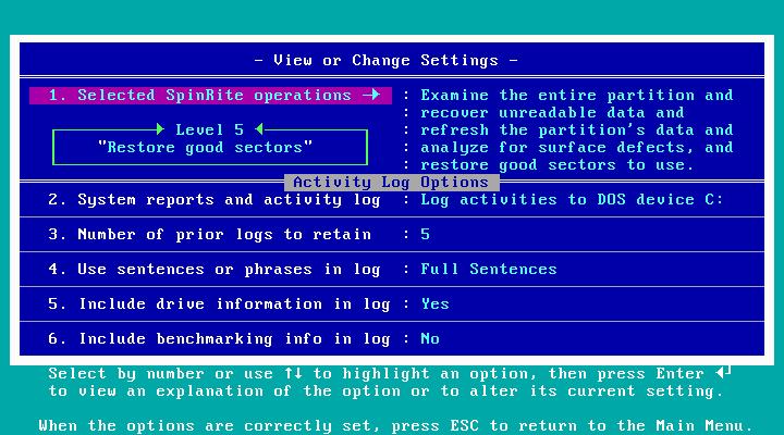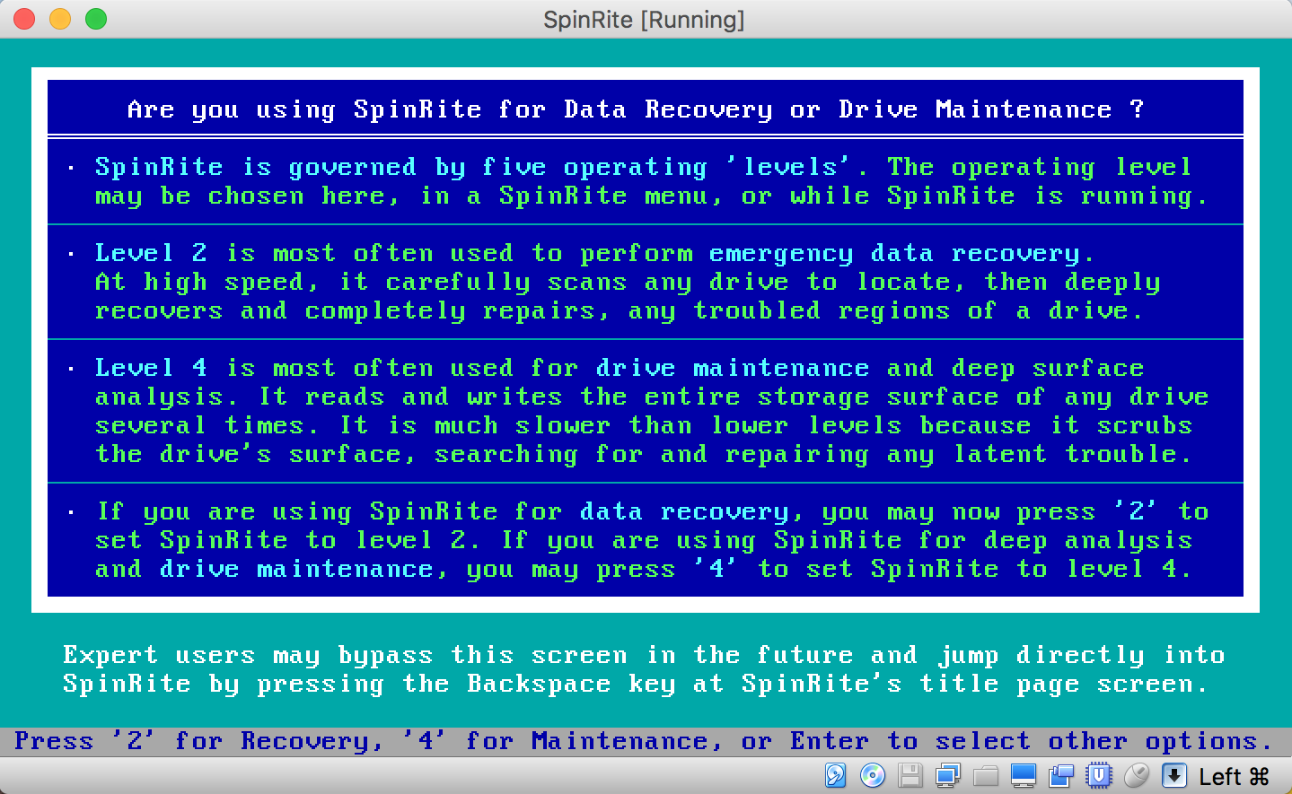Перед переходом к основному меню SpinRite показывает экран, где текущий уровень виден сразу и меняется одной клавишей: