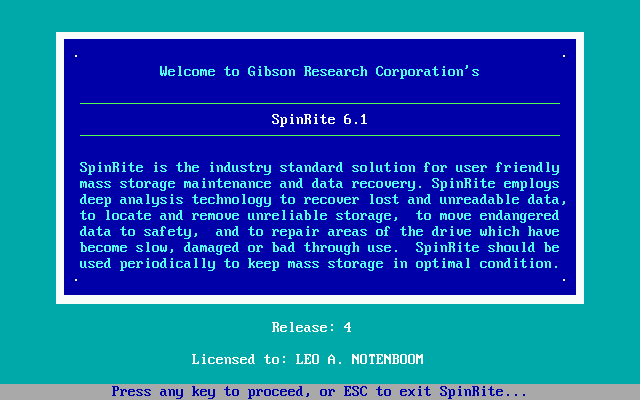На интро-экране SpinRite показывает сведения о программе и лицензии.