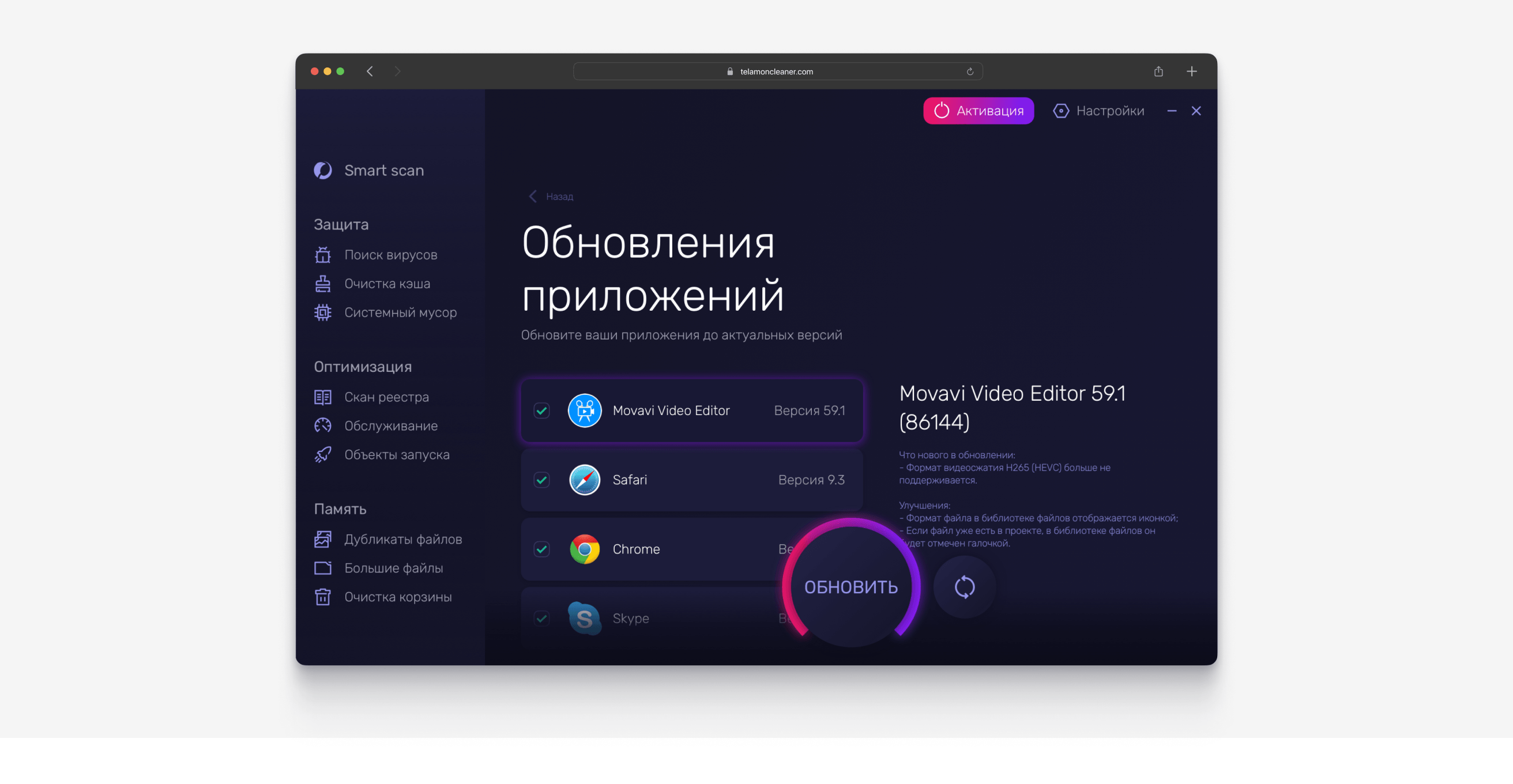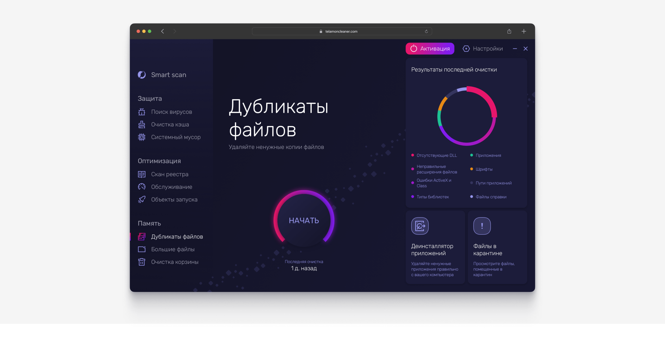 Кнопка Settings вынесена в верхнюю панель, рядом с Activation. Это подчёркивает, что Telamon Cleaner рассчитан на регулярное использование: параметры не спрятаны, а доступны из любого раздела.