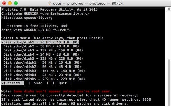 Далее TestDisk показывает список физических устройств. Выбор делается стрелками и подтверждается через Proceed (Enter). В Windows это часто выглядит как PhysicalDrive, в Linux — /dev/sdX, в macOS — /dev/diskX. -