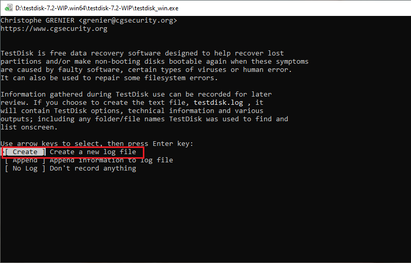 На стартовом экране TestDisk предлагает варианты:-
