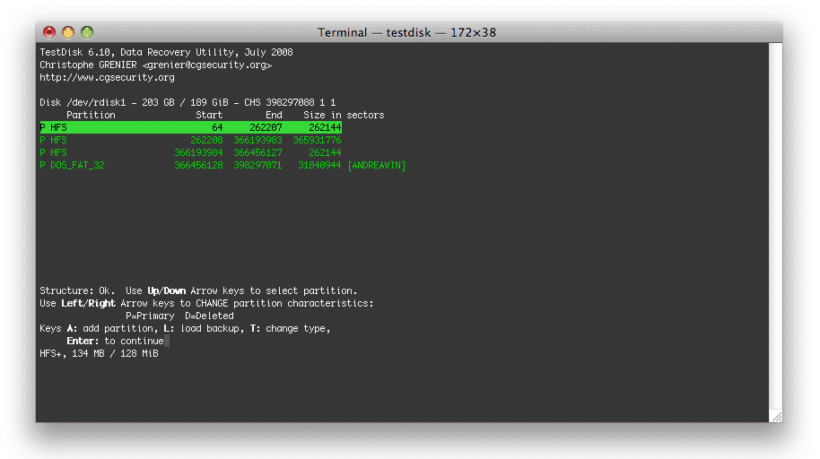 Analyze current partition table: TestDisk выводит текущую таблицу разделов и отмечает ошибки структуры или явные проблемы в найденных записях.