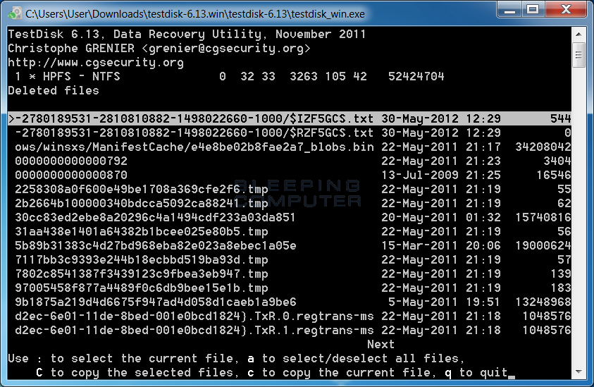 В NTFS режиме TestDisk сканирует записи MFT и показывает список удалённых файлов. В документации описаны конкретные действия: