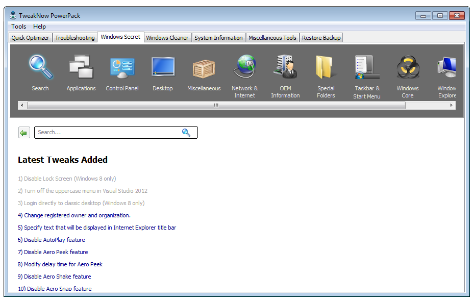В некоторых сборках сверху предусмотрена строка поиска (поле поиска твиков) и блок вроде Latest Tweaks Added, где список последних добавленных настроек выводится текстом.