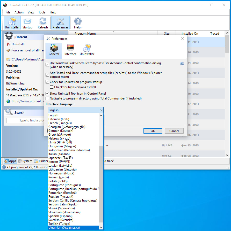 Uninstaller — список приложений и операции удаления.