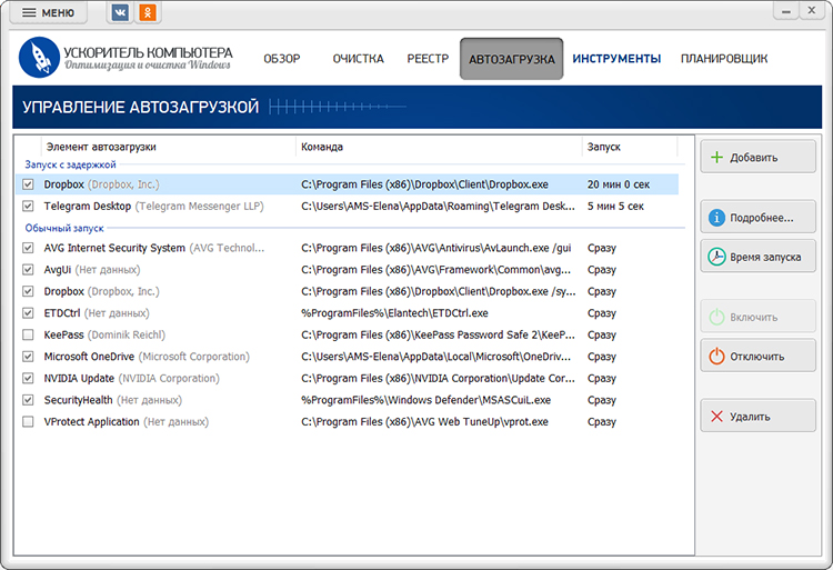 Позволяет управлять автозагрузкой: отключать/включать элементы, удалять, добавлять, настраивать время запуска.