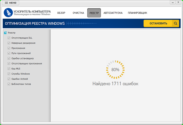 Раздел РЕЕСТР Ускорителя Компьютера визуально похож на «Очистку»: слева — типы ошибок, справа — результат, сверху — элементы управления сканированием и исправлением. Во время поиска отображается кнопка ОСТАНОВИТЬ, а после завершения доступно исправление через ИСПРАВИТЬ.