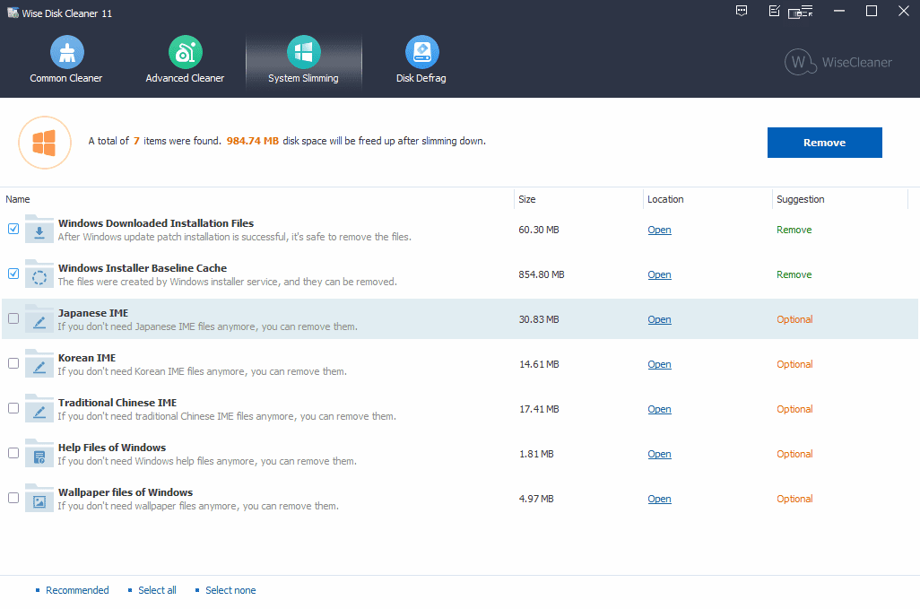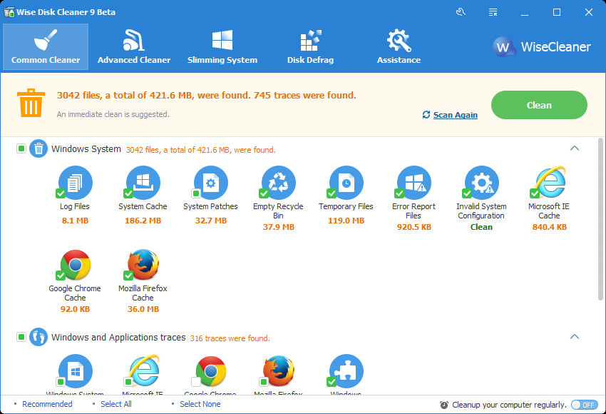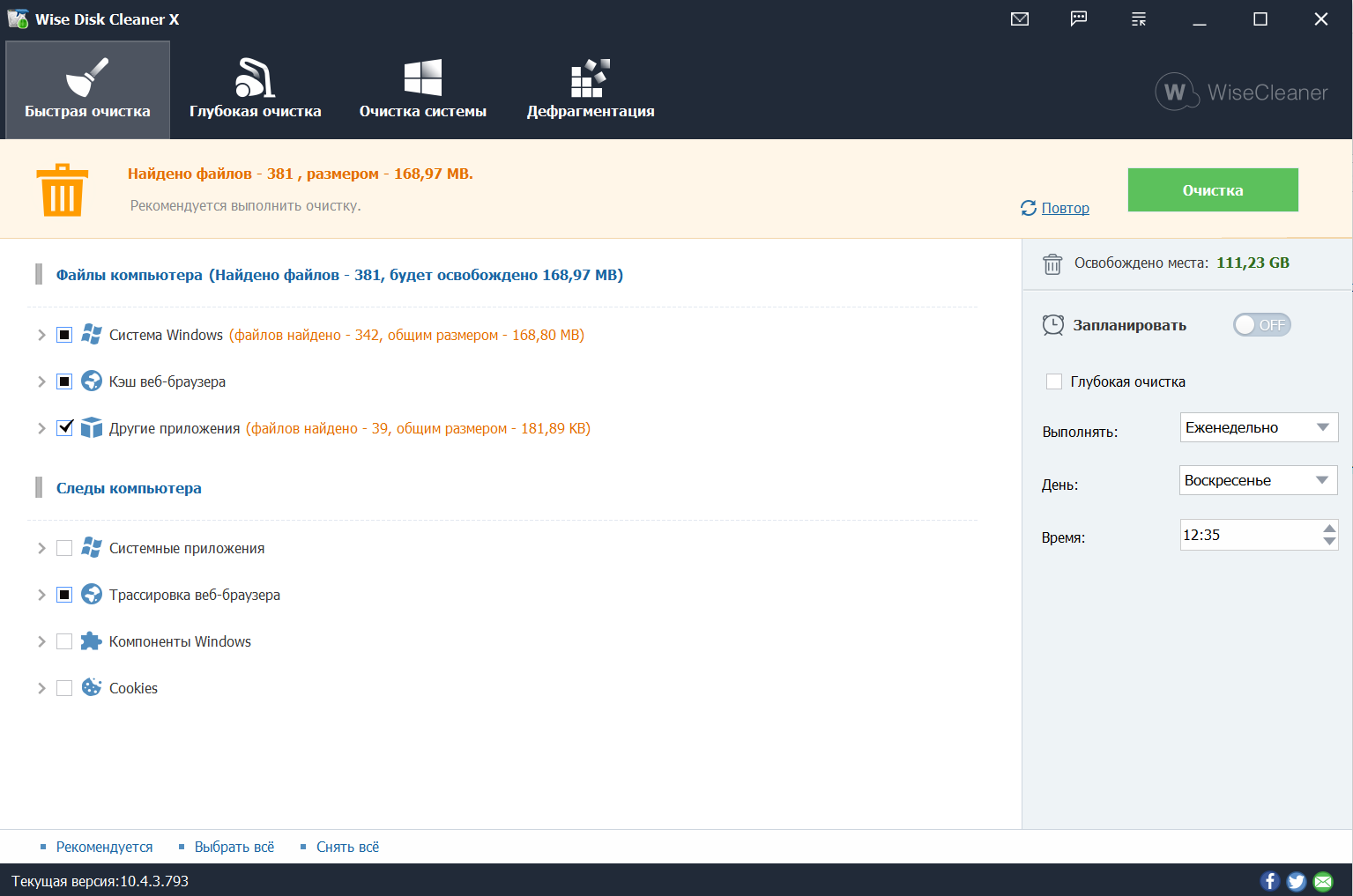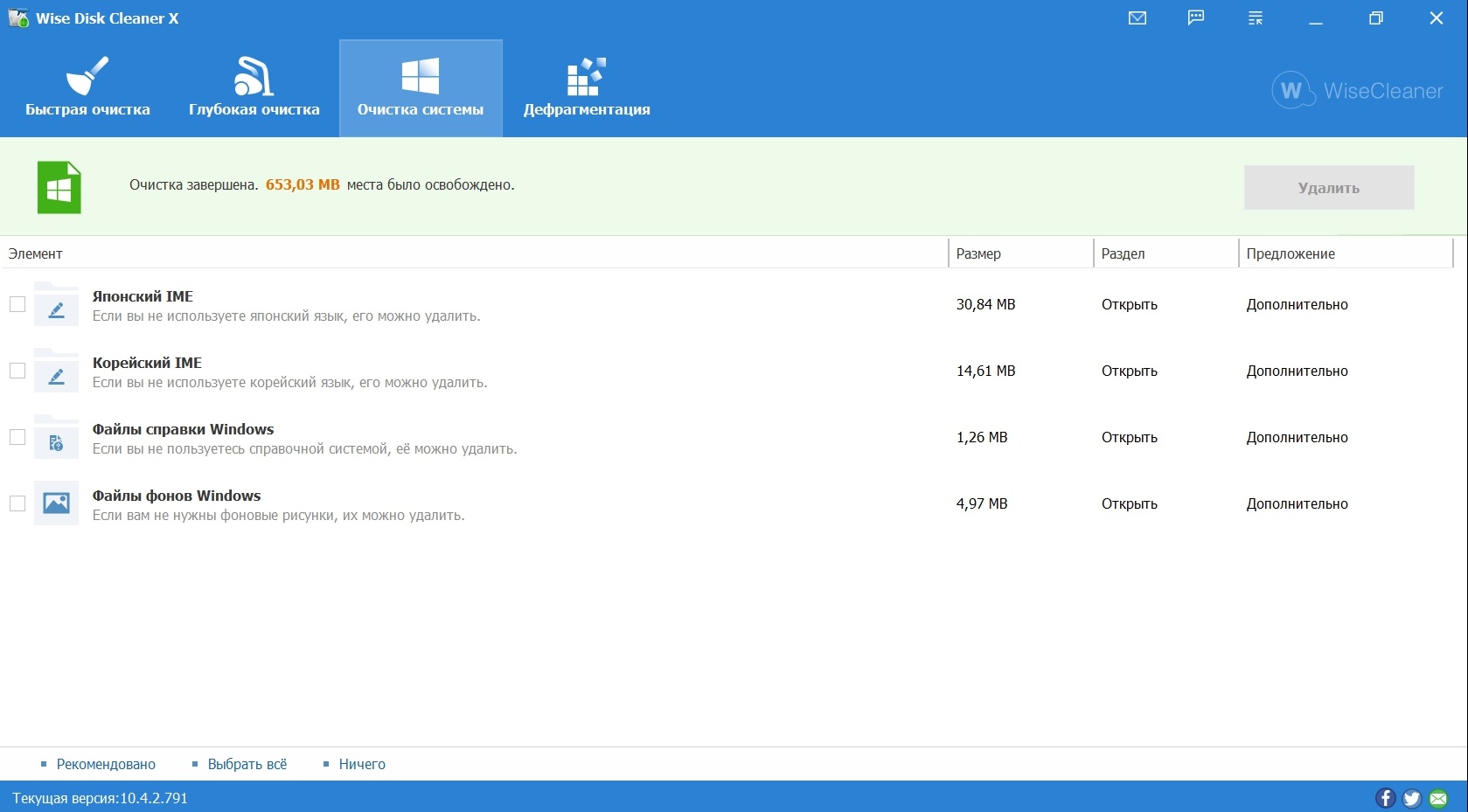 если задача шире (системные логи, кэш миниатюр, остатки обновлений Windows + дефраг/оптимизация), Wise Disk Cleaner закрывает это «в одном окне» через Common Cleaner + Disk Defrag.